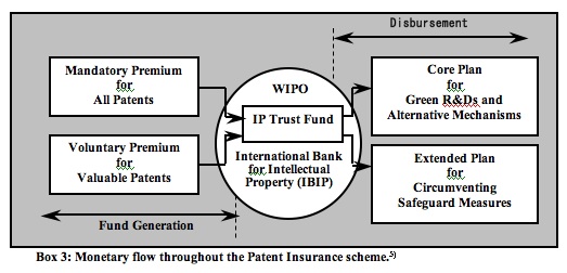 The Green IP scheme is designed to impose the “IP premium” in addition to existing official fees on patent applicants/owners to create the “IP trust fund (see Box 3).” The premium would consist of mandatory and voluntary fees, which would finance the core and extended plans, respectively. The IP trust fund would be operated by the International Bank for Intellectual Property (IBIP), a financing institution that could be an affiliated entity of the World Intellectual Property Organization (WIPO).