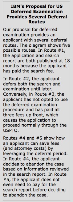 While deferred examination has been successful for decades elsewhere, the United States has not yet chosen to adopt a useful deferred examination procedure. The arguments against deferred examination, which have hampered past proposals, are addressed by IBM’s proposed approach.
